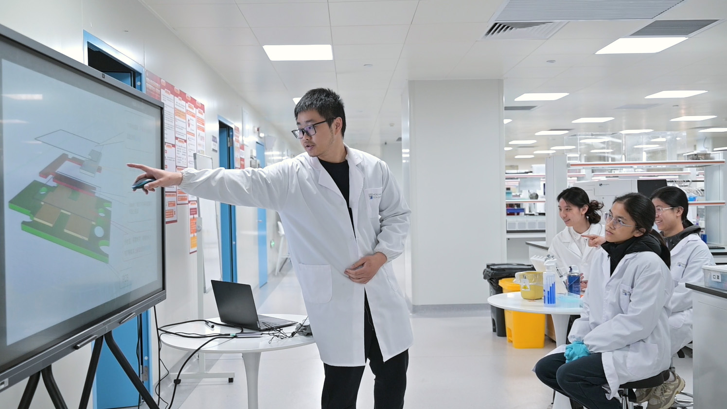 数字微流控技术,作为一种前沿的科学技术,近年来在生物医学、环境监测、药物研发等领域展现出巨大的应用潜力。为了让学生了解这一技术,培养他们对科学的兴趣, 微纳中心主任赵蒙研究员带领工程师团队,为此次活动进行现场讲解及操作演示。